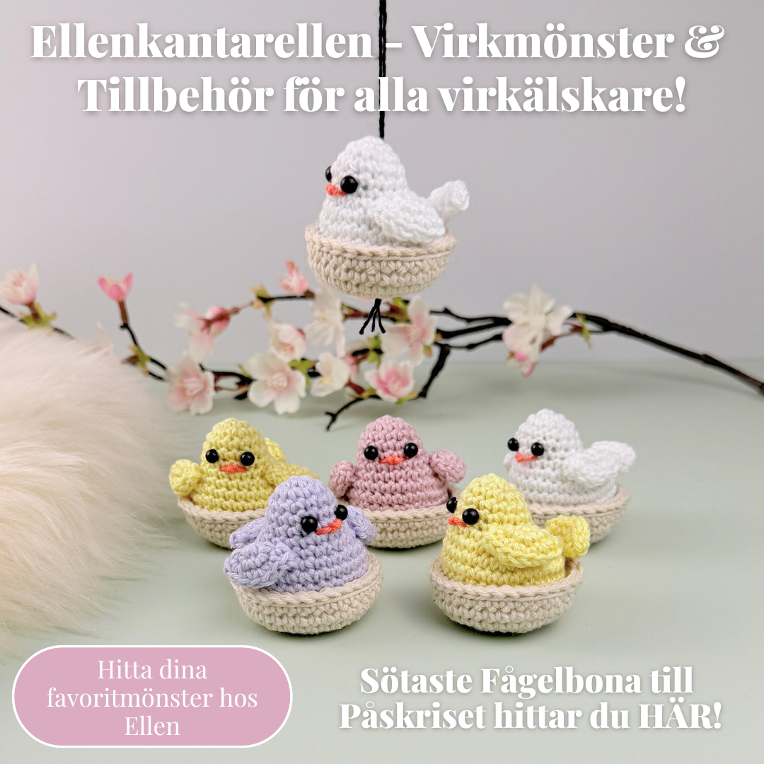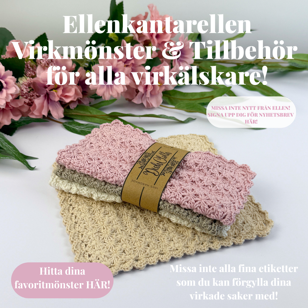 Hos ellenkantarellen hittar du virkmönster med mycket kärlek och många timmar bakom, och tanken är att vem du än är som virkar så ska du kunna hitta ett mönster som passar dig! Jag brinner för design och vill gärna få till det där lilla extra – en av mina storsäljare Bustomte är ett bra exempel på detta! Mönsterpaket är nytt hos mig – men en kategori som kommer att utvecklas mer och mer. Du hittar även underbara Etiketter och andra utskriftbara saker som förgyller de saker du virkar!