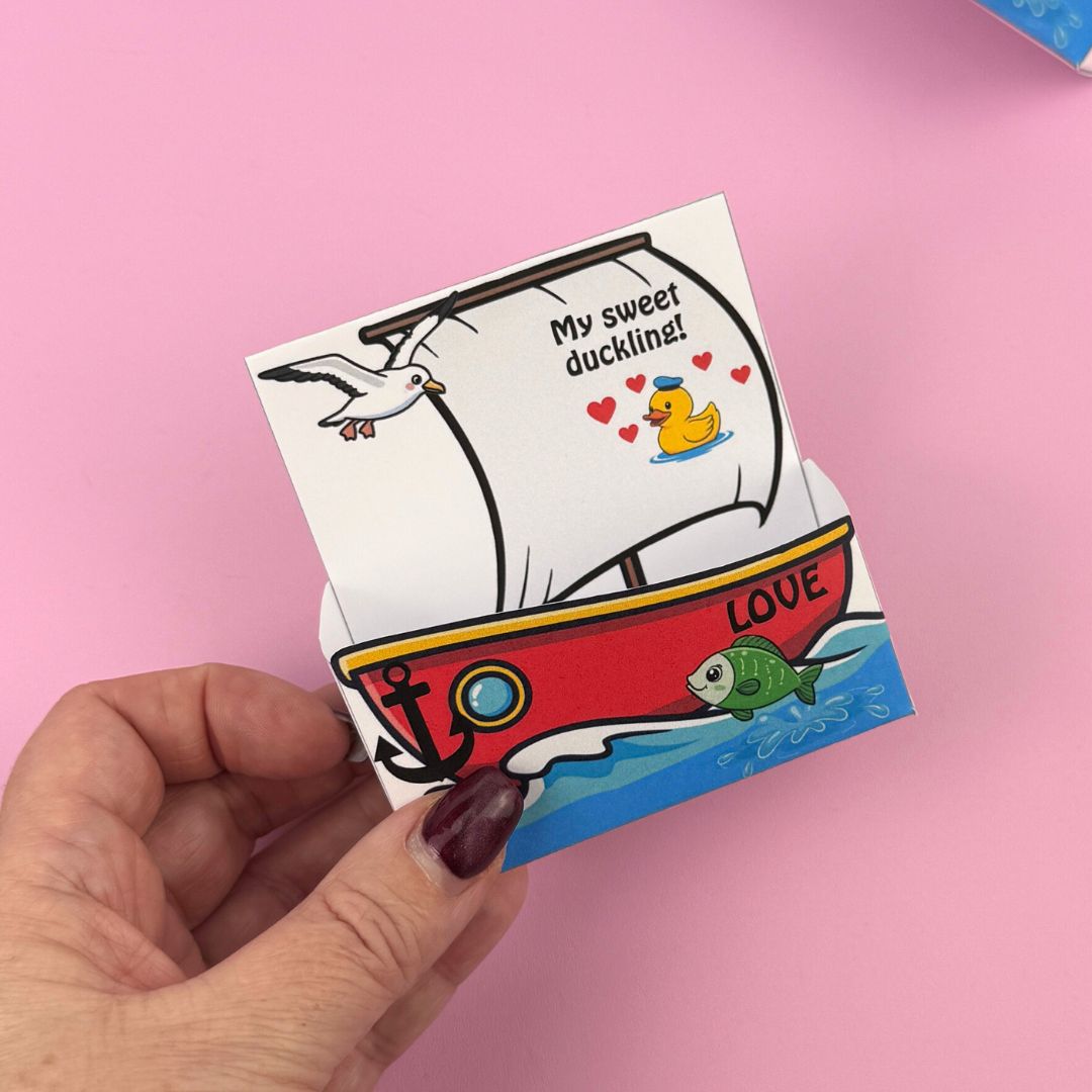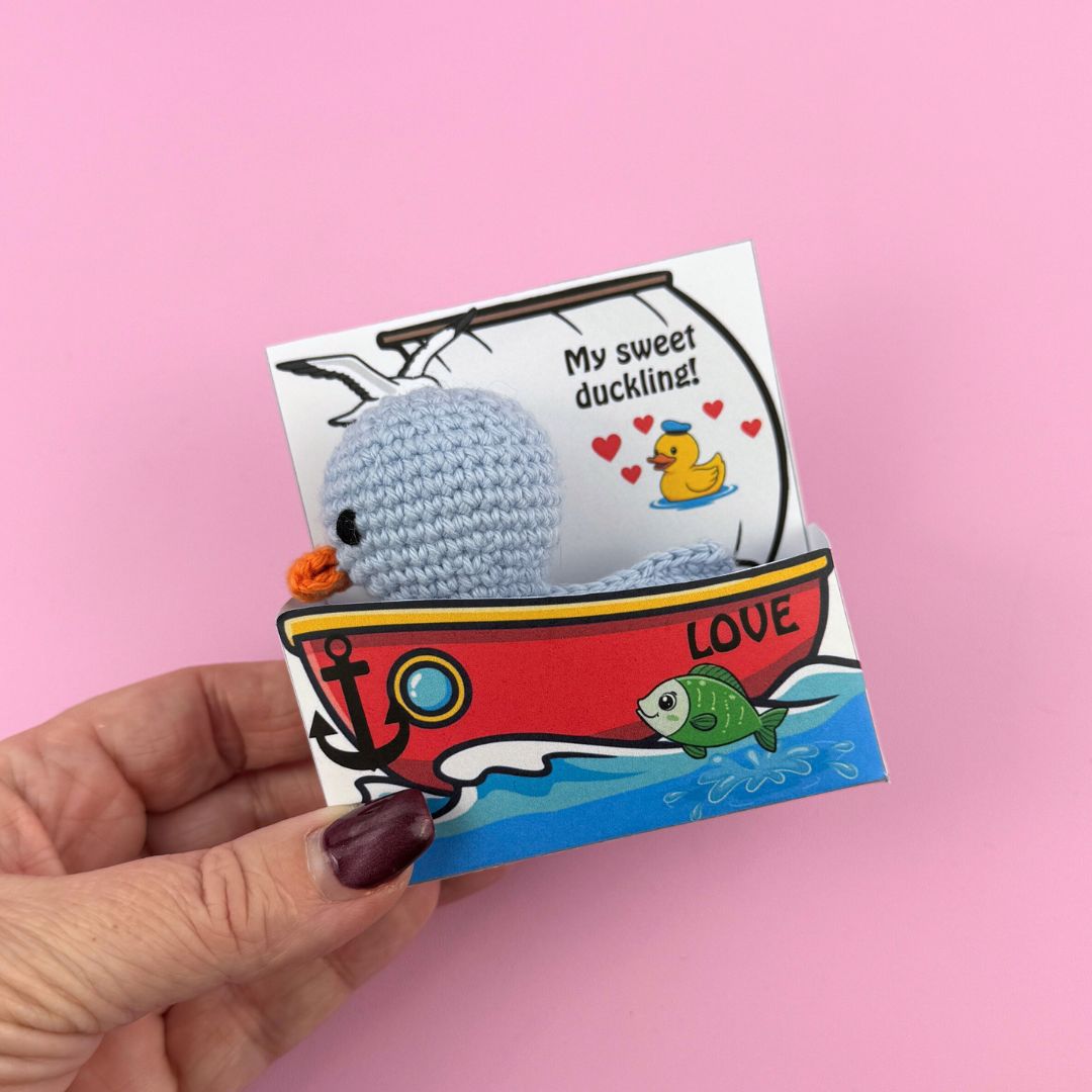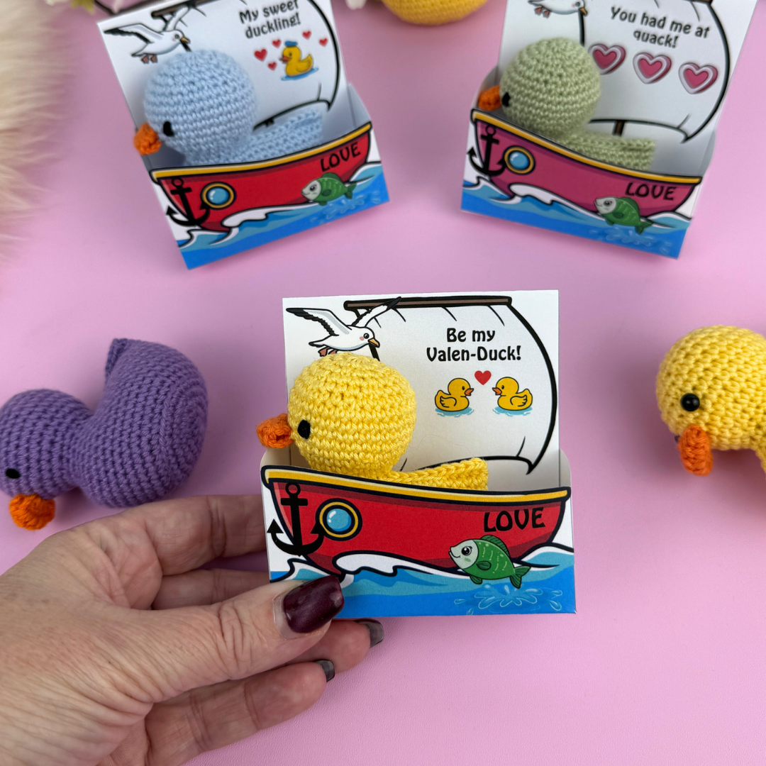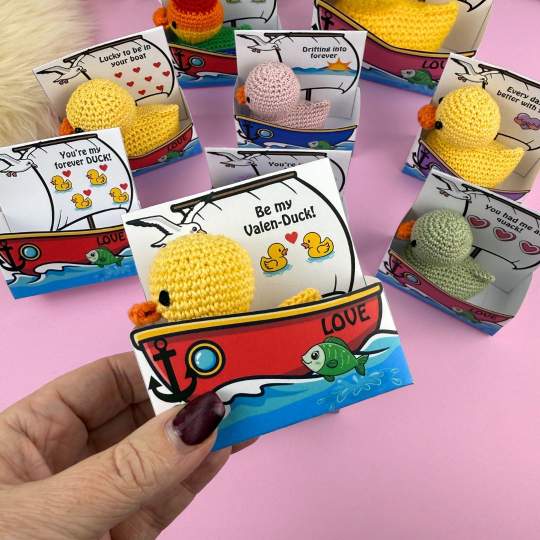 Askarna är i två storlekar så att de passar både 8/4 garn och akrylgarn. 11 olika meddelanden och två blanka om du vill skriva ett eget meddelande! Virka den gulliga ankan, skriv ut asken och ge bort till alla du tycker om – garanterat den sötaste presenten till ”Alla hjärtans”!