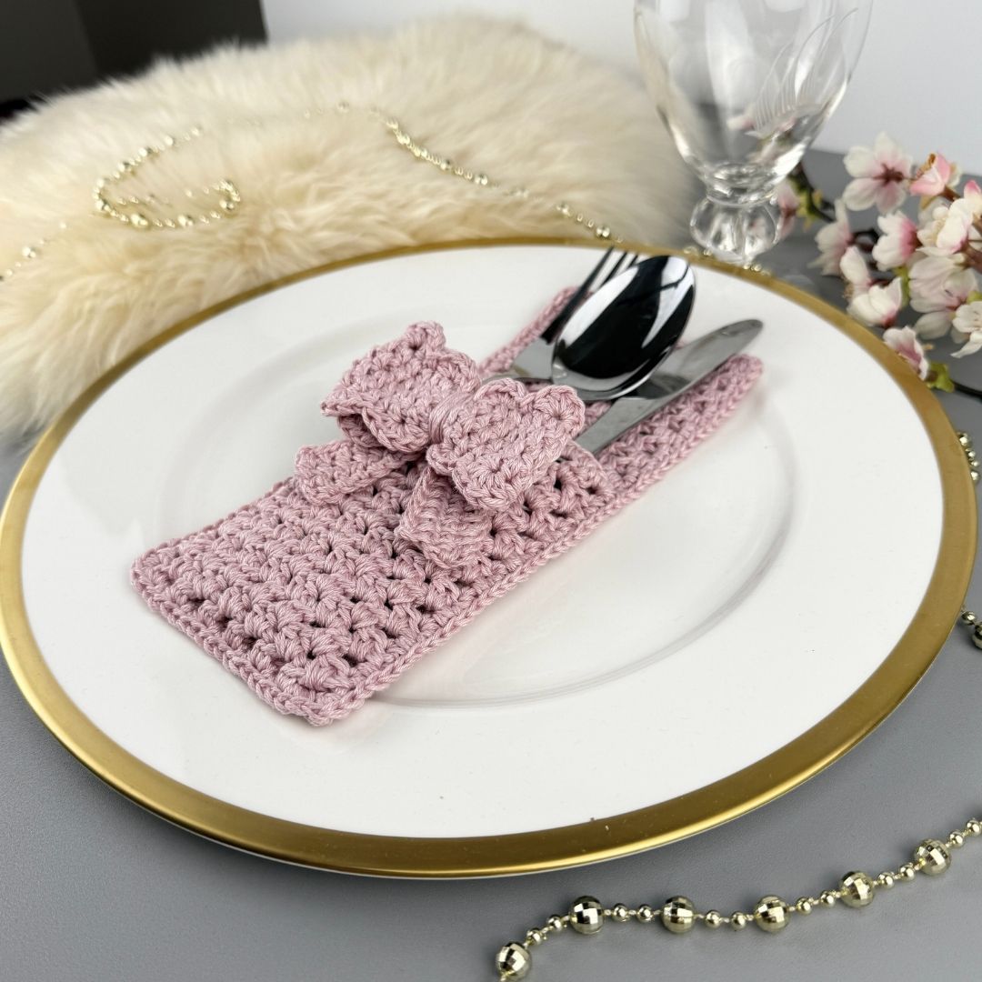 Mönster Virkad Bestickhållare ”Heather” med Rosett