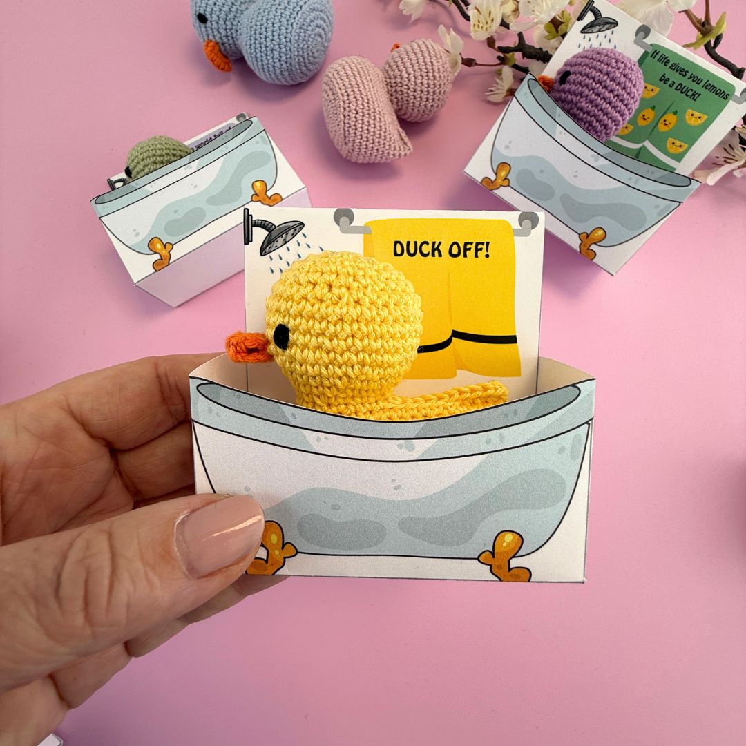 Mönster på min supersöta virkade GummiAnka! ”No sew” mönster med tillhörande utskriftbar badkarsbox! När du betalat för mönstret kommer du automatiskt att kunna ladda ner din PDF-fil med ditt nya roliga mönster som kommer i mejl till dig!