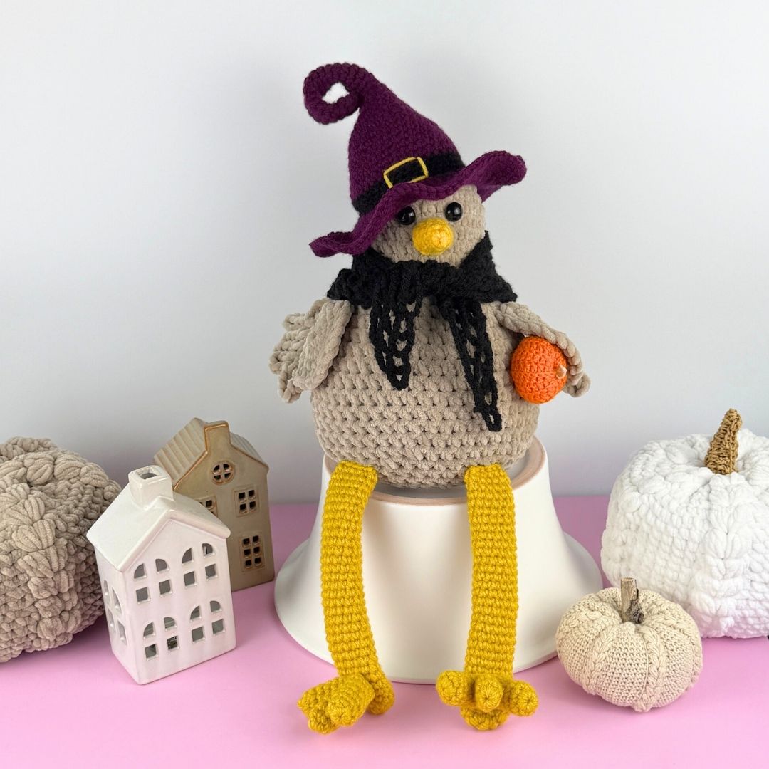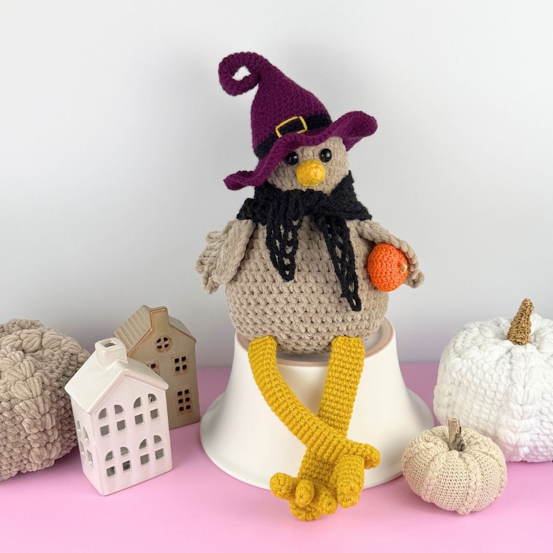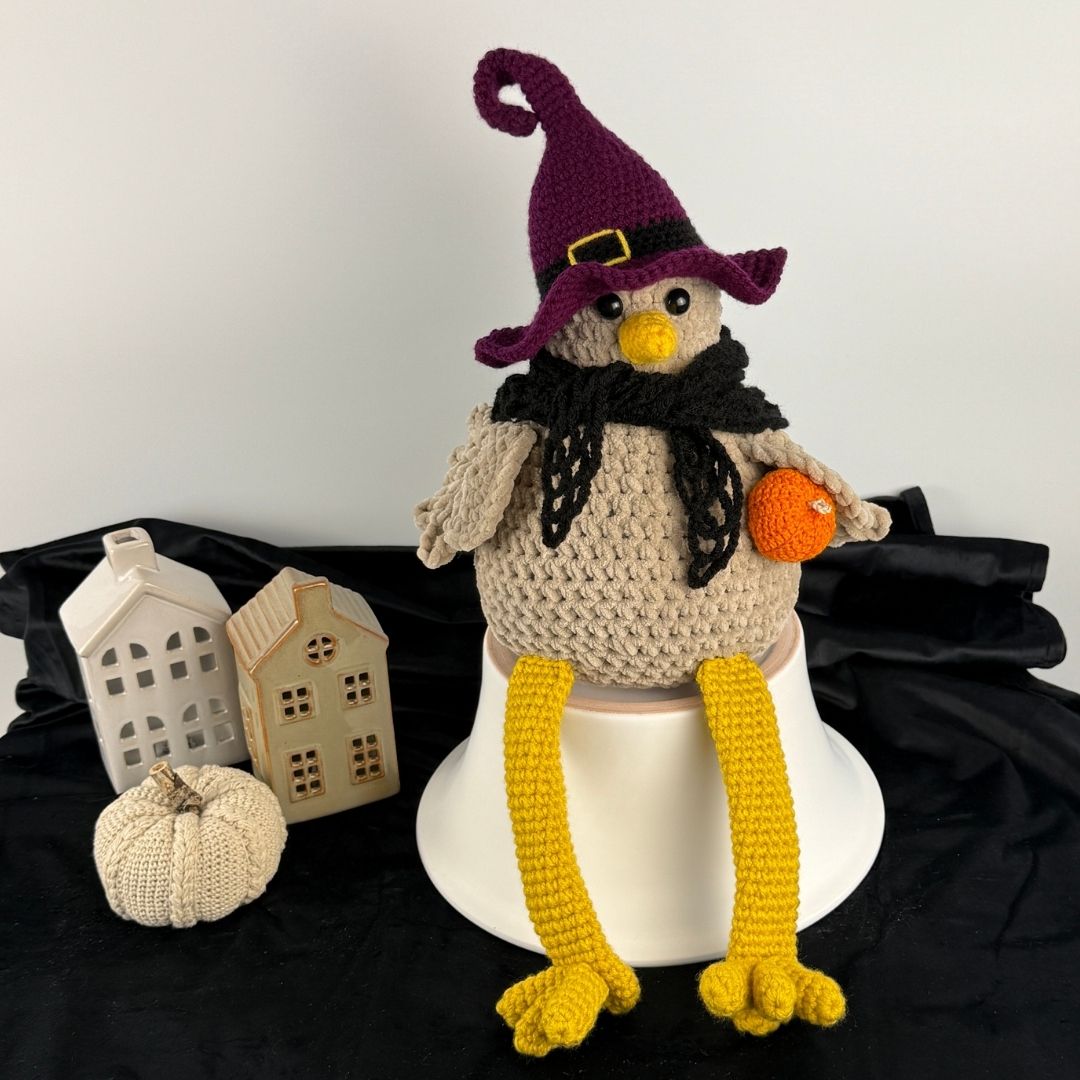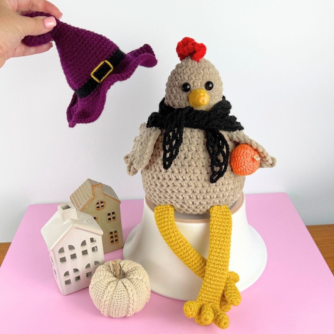 Mönster på Häxhatt och Sjal till supersöta Hönan Polly! Ett måste till Halloweenfirandet! Virkas med akrylgarn och virknål 4 mm! Har du inte skaffat mönstret till min ”Bokhyllehöna” Polly än så hittar du möntret HÄR!