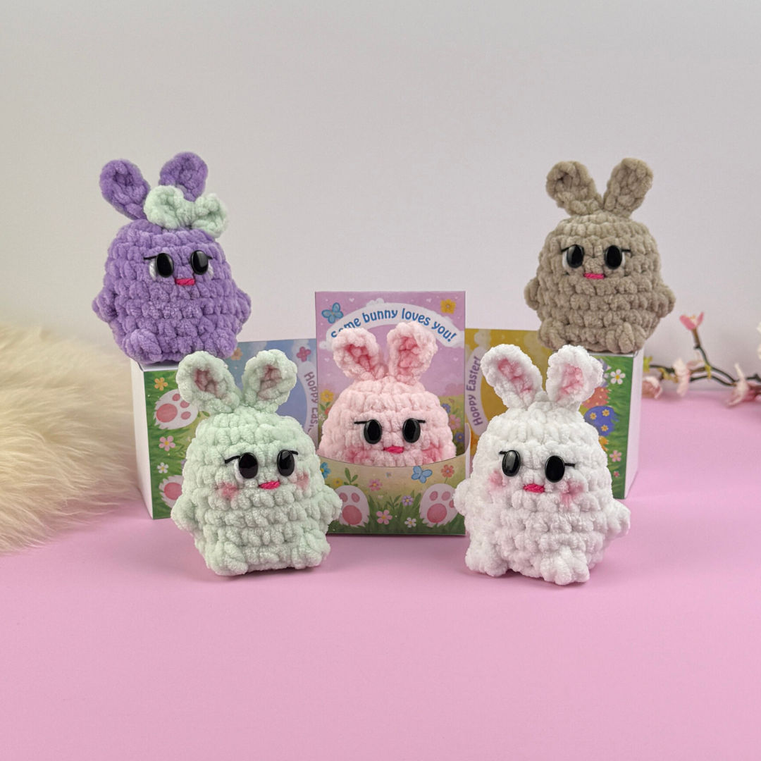 Mönster på min supersöta virkade fluffiga Kanin med tillhörande utskriftbar ask. 5 olika utseenden med ”Glad Påsk”-text på svenska, 12 olika utseenden med lite rolig engelsk text samt en mall där du kan ändra texten till det du själv önskar! Ett mönster som passar både nybörjare som van! Kaninen är virkat i chenillegarn och blir cirka 7.5 x 7 cm, boxen blir cirka 10,5 x 8 cm stora. Perfekta presenten på Påsk!