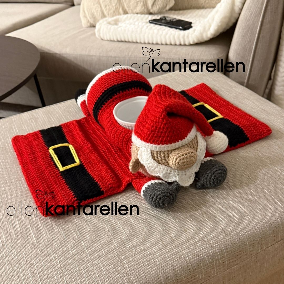 Mönster på supersöt Tomte Soffaförvaring att hänga över armstödet på din soffa eller fåtölj – till exempelvis din favoritkopp kaffe, godisskål samt fjärrkontroller bok eller padda! Virkas med akrylgarn! Jättefin att ha hemma själv eller ett måste som present! Ett måste för alla julälskare!