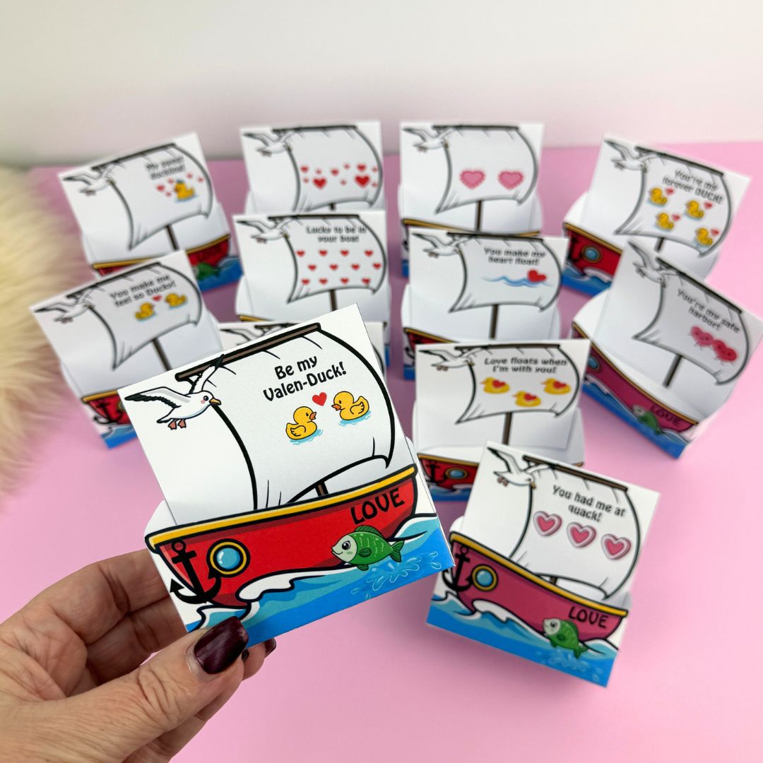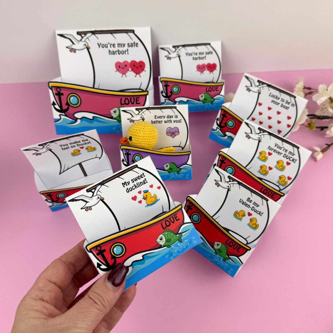 Askarna är i två storlekar så att de passar både små och lite större Ankor! 11 olika meddelanden och två blanka om du vill skriva ett eget meddelande! Skriv ut asken, stoppa i en gullig handgjord Anka och ge bort till alla du tycker om – garanterat den sötaste presenten till ”Alla hjärtans”! Behöver du mönster till Anka hittar du det HÄR!