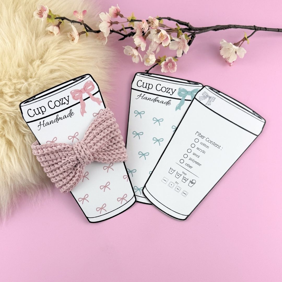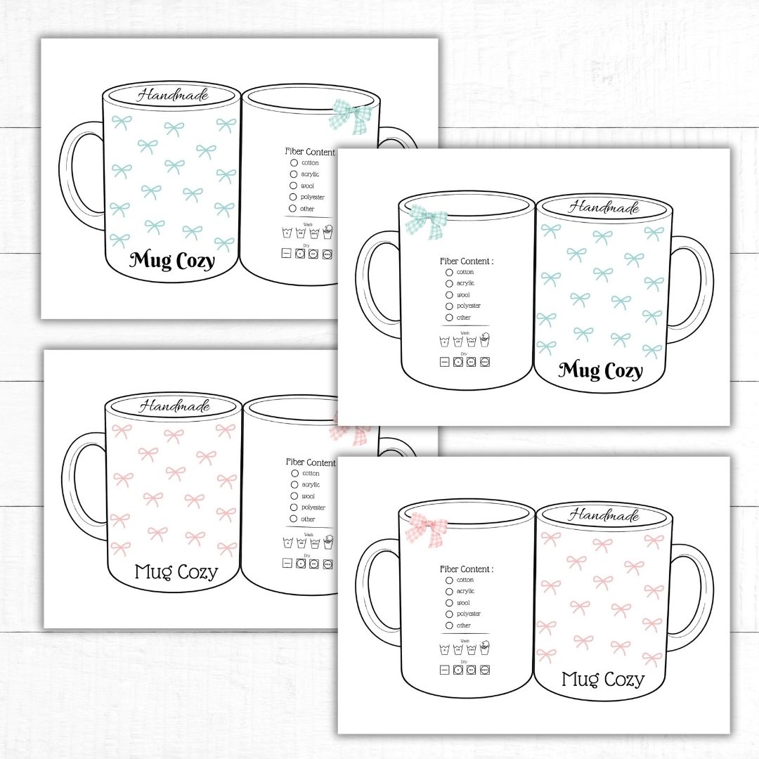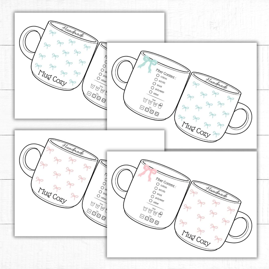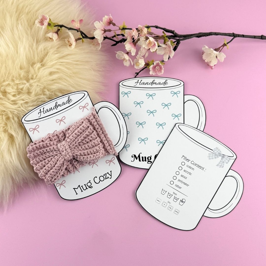 Supersöta utskriftbar etikett/display för dina handgjorda muggärmare. Fram- och baksida med innehåll och tvättinstruktioner på baksidan. Fyra olika utseenden två vanliga muggar och två ”to go” muggar. Du får mallar i färgerna rosa och turkos, men blir även jättefina i gråskala! Dessa är perfekta om du ska sälja eller som en underbar present till någon du tycker om!