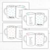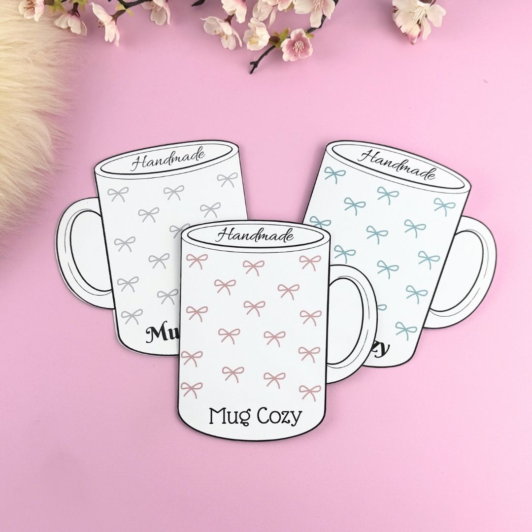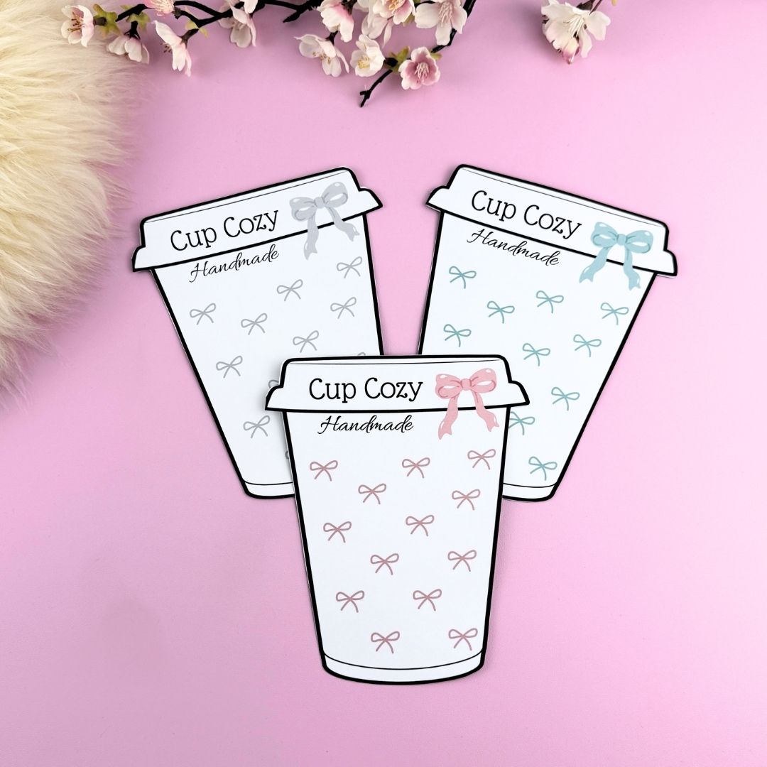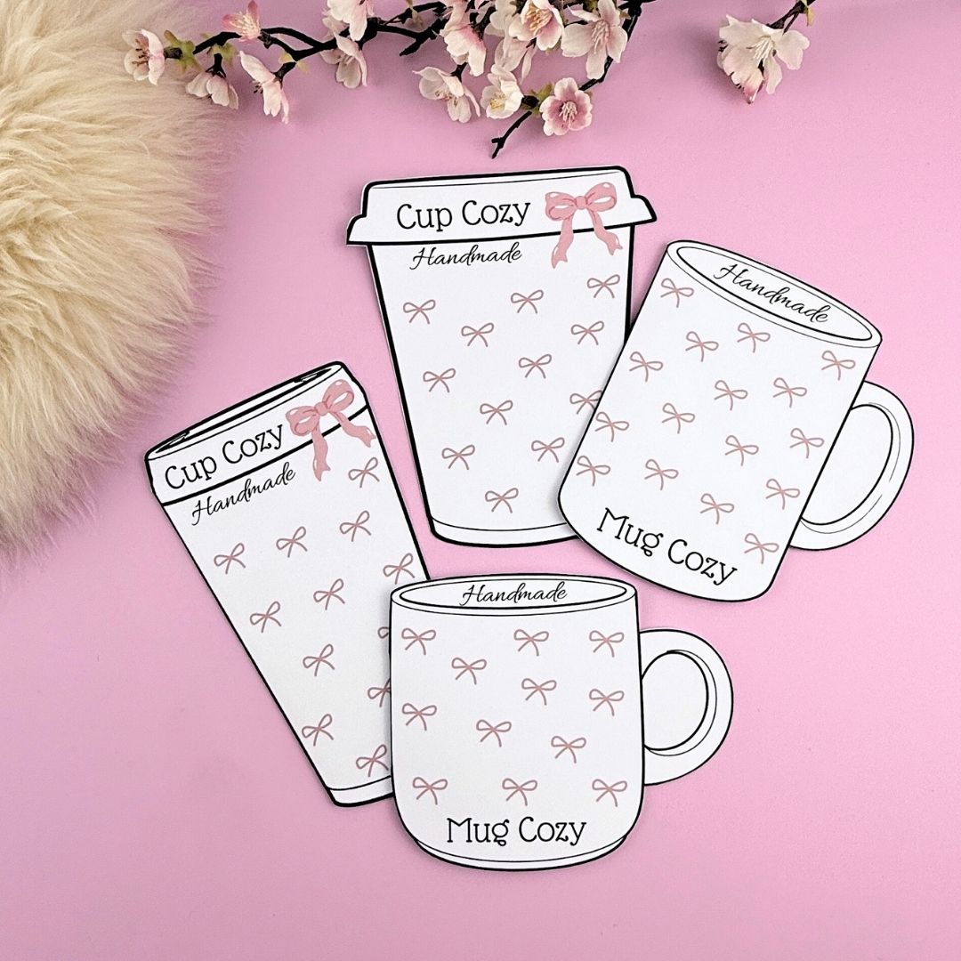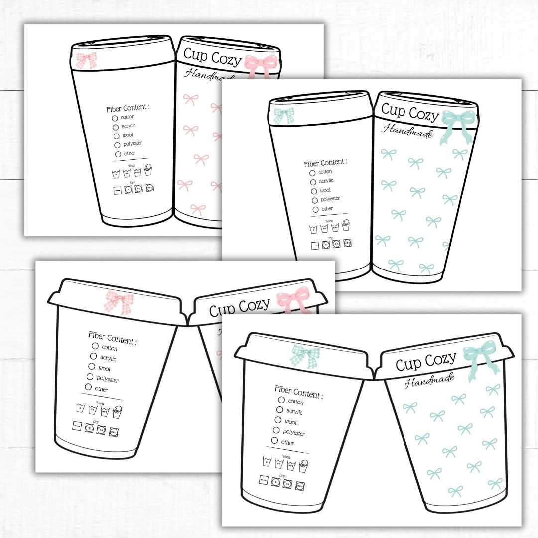 Supersöta utskriftbar etikett/display för dina handgjorda muggärmare. Fram- och baksida med innehåll och tvättinstruktioner på baksidan. Fyra olika utseenden två vanliga muggar och två ”to go” muggar. Du får mallar i färgerna rosa och turkos, men blir även jättefina i gråskala! Dessa är perfekta om du ska sälja eller som en underbar present till någon du tycker om!