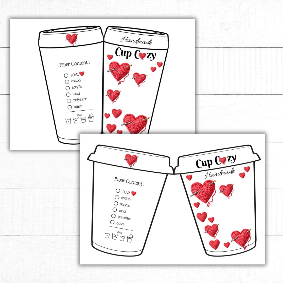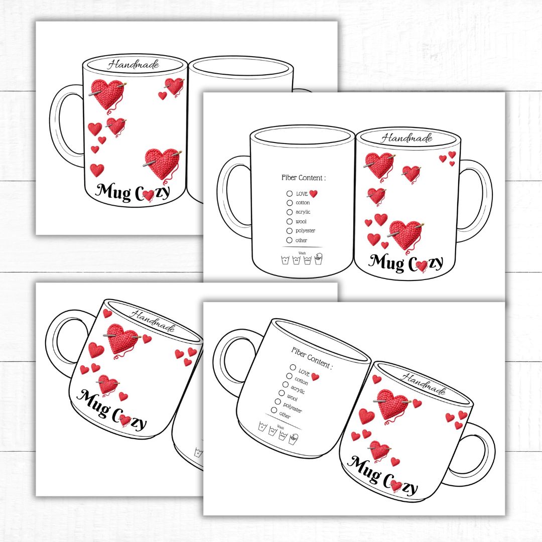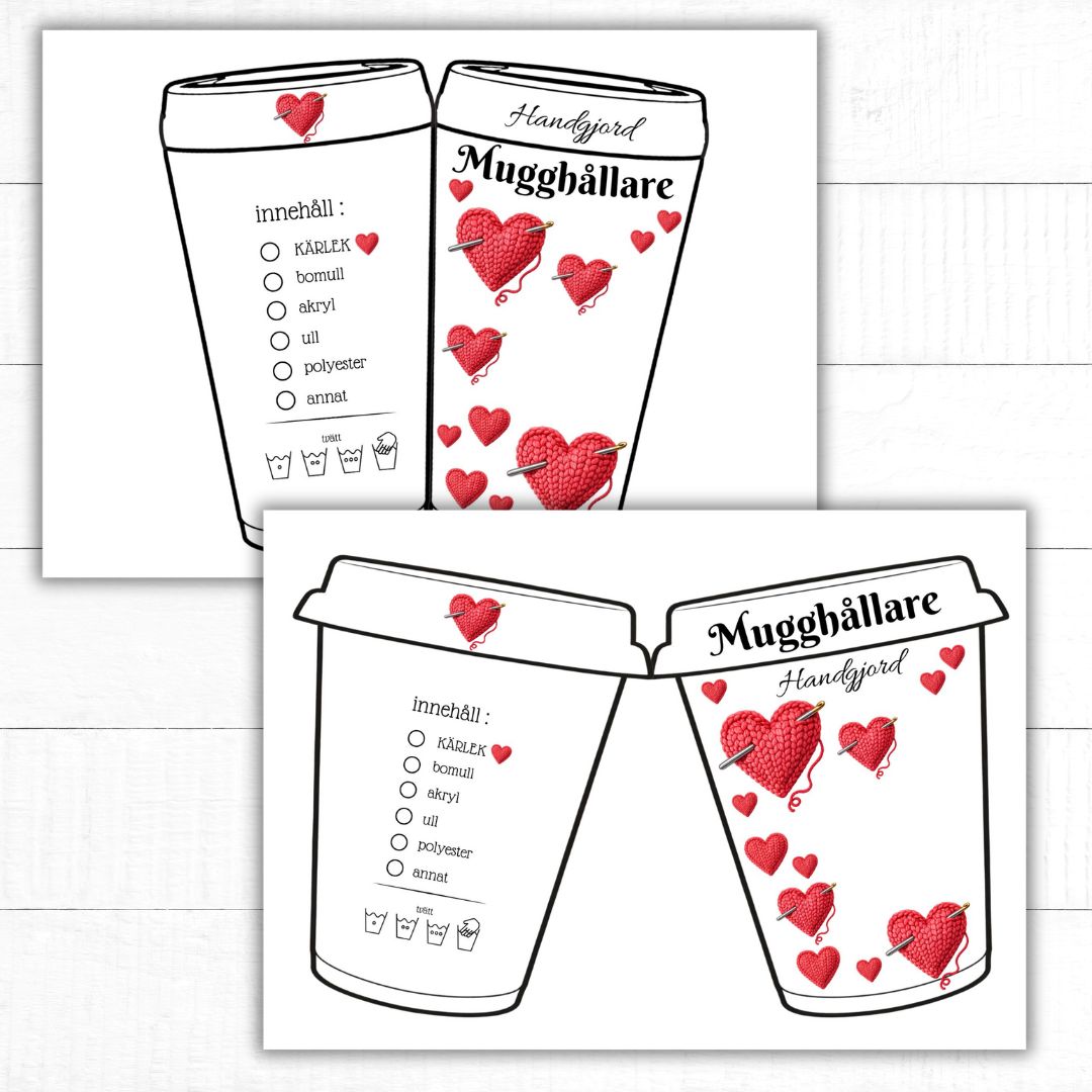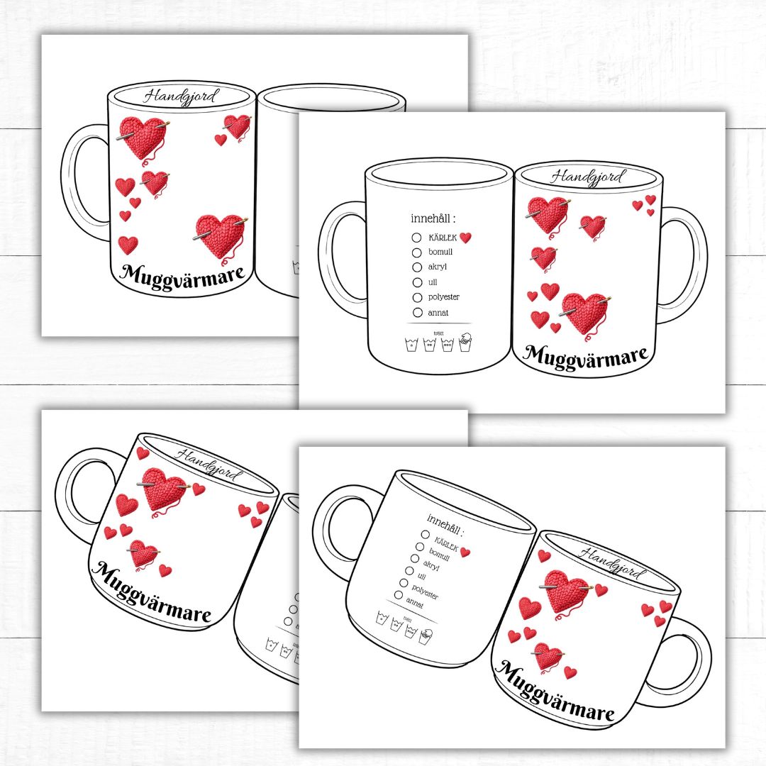 Supersöta utskriftbar etikett/display för dina handgjorda muggärmare med söta Hjärtan. Fram- och baksida med innehåll och tvättinstruktioner på baksidan. Fyra olika utseenden två vanliga muggar (med örat både åt höger och vänster) och två ”to go” muggar. Dessa är perfekta om du ska sälja eller som en underbar present till någon du tycker om! Mallar med både Svensk & Engelsk text!