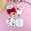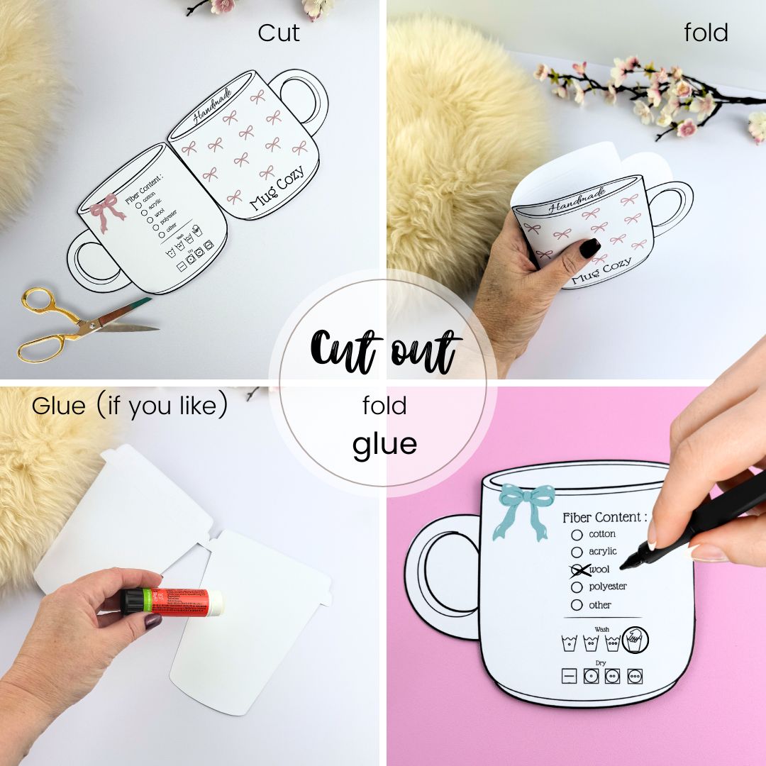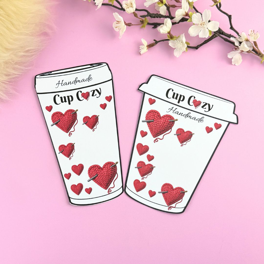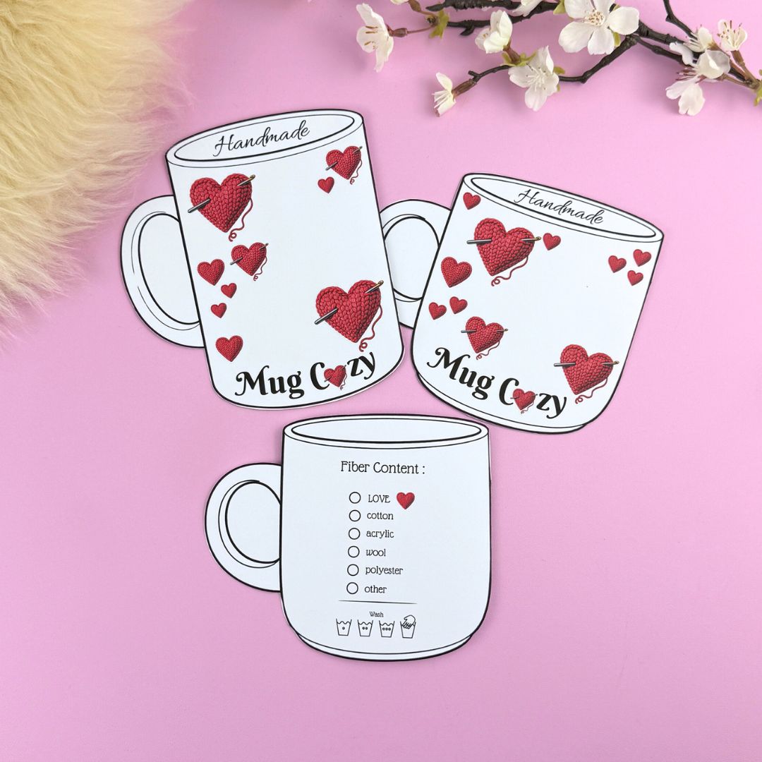 Supersöta utskriftbar etikett/display för dina handgjorda muggärmare med söta Hjärtan. Fram- och baksida med innehåll och tvättinstruktioner på baksidan. Fyra olika utseenden två vanliga muggar (med örat både åt höger och vänster) och två ”to go” muggar. Dessa är perfekta om du ska sälja eller som en underbar present till någon du tycker om! Mallar med både Svensk & Engelsk text!