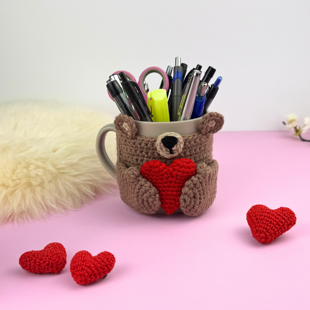Mönster på supergullig virkad Mugghållare med söt Nallebjörn som håller i ett Hjärta!! När du betalat för mönstret kommer du automatiskt att kunna ladda ner din PDF-fil med ditt nya smarriga mönster som kommer i mejl till dig!