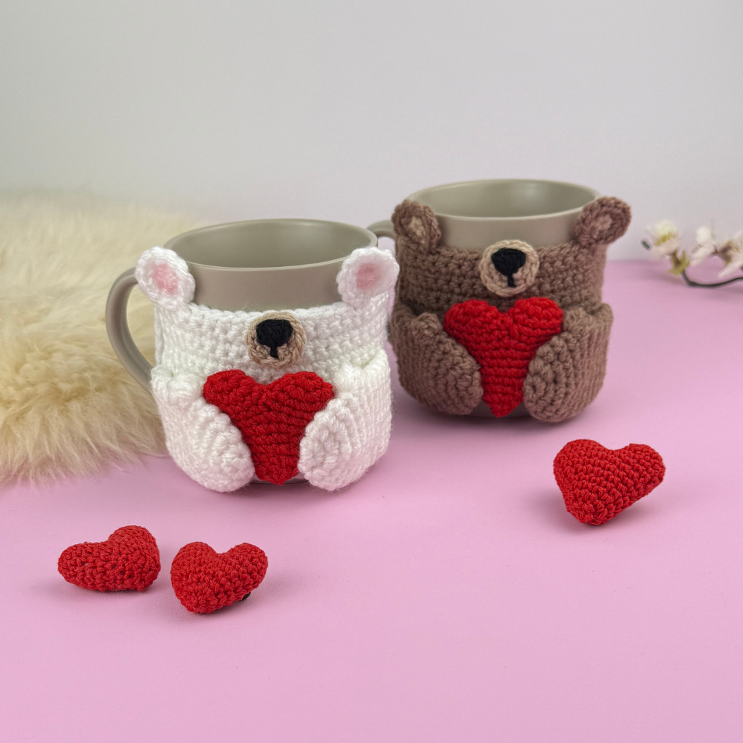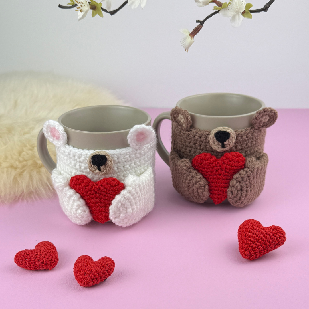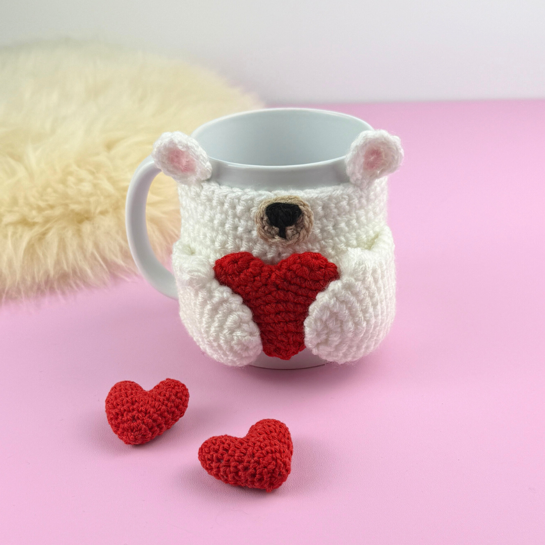 Mönster på supergullig virkad Mugghållare med söt Nallebjörn som håller i ett Hjärta! Söt att pryda favoritmuggen med och att ge bort som en present till Alla Hjärtans Dag! Ett mönster som passar både nybörjare som van!